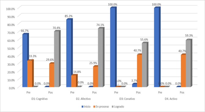 En la figura 2 se muestra el análisis comparativo de las dimensiones de conciencia ambiental revela transformaciones significativas y diferenciadas. La dimensión cognitiva evolucionó de un 66.7% en nivel inicial a un 70.4% en nivel logrado, demostrando una rápida mejora en la comprensión conceptual. La dimensión afectiva progresó desde un 85.2% inicial hasta alcanzar un 74.1% en nivel logrado, evidenciando un notable desarrollo del compromiso emocional. En la dimensión conativa, partiendo del 100% en nivel inicial, se logró que un 55.6% alcanzara el nivel máximo y un 40.7% el nivel de proceso, reflejando una progresiva adopción de comportamientos ambientalmente responsables. La dimensión activa, también iniciando en 100% inicial, alcanzó un 77.8% en nivel logrado y un 22.2% en proceso, demostrando un significativo involucramiento práctico. Estos patrones diversos sugieren que mientras las dimensiones cognitiva y afectiva muestran avances más inmediatos, las dimensiones activa y conativa requieren un proceso de transformación más gradual y profundo.