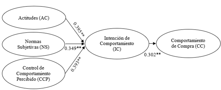 La examinación de las relaciones entre las variables del modelo permitió aceptar las cuatro hipótesis. A través de los estimados arrojados en el AMOS Output, se demostró que la Actitud (AC) (β=0,395**), y las Normas Subjetivas (NS) (β=0,349**) influyeron notablemente en la Intención de Compra (IC), mientras que el Control de Comportamiento Percibido (CCP) (β=0,393**) influenció moderadamente. Por otra parte, se evidenció que las Intenciones de Compra (IC) (β=0,3002**), influyen notablemente sobre el Comportamiento de Compra (CC). La Tabla 4 refleja los resultados finales del estudio.