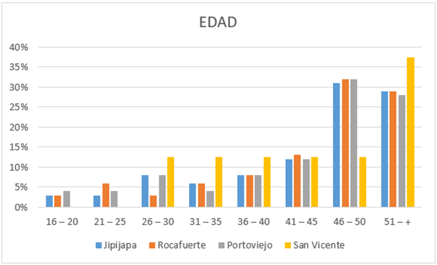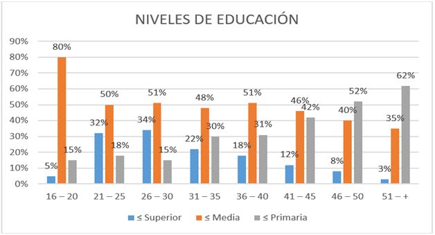 Una de las variables más importantes para explicar el diagnóstico es el nivel de educación de los apicultores. La educación media es predominante en el rango de 16 a 45 años. Los mayores de 46 años muestran un nivel educativo de primaria. Los jóvenes de entre 21 y 41 años, han logrado algún nivel de educación superior.
