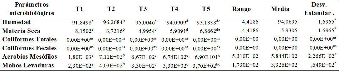Se logra evidenciar en la tabla 1, que en base a la humedad que varía en un rango de 4.42 puntos porcentuales, con una media de aproximadamente 94.07% y una desviación estándar de 1.70, considerando la baja desviación estándar sugiere una consistencia en los niveles de humedad; en cuanto a la materia seca muestra una variación similar a la humedad, con un rango de 4.42 puntos porcentuales, la media es de aproximadamente 5.93%, con una desviación estándar de 1.70; en cuanto a los Coliformes Totales y Fecales, no se detectaron coliformes totales ni fecales en ninguna de las muestras; en los recuentos de aerobios mesófilos varían en un rango de 531 unidades, con una media de 584.4 y una desviación estándar de 226.6, la desviación estándar relativamente alta sugiere una variabilidad significativa en los recuentos; por último los recuentos de mohos y levaduras tienen un rango de 173, con una media de 332.6 y una desviación estándar de 64.9, al igual que con los aerobios mesófilos, la desviación estándar sugiere cierta variabilidad en los resultados.