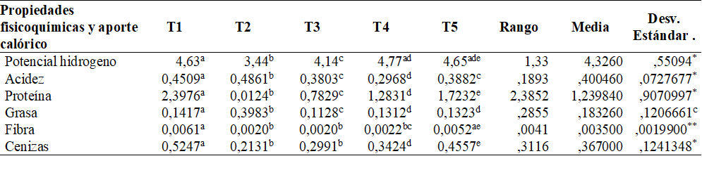 Las propiedades fisicoquímicas y el aporte calórico de las bebidas, proporcionan una visión detallada de su composición, donde el potencial hidrogeno (pH) exhibe variaciones significativas entre los tratamientos, destacando la diversidad en la acidez de las muestras con una tendencia descendente, siendo la muestra T1 la que tiene el contenido más alto como las cenizas en el mismo tratamiento, mientras que la grasa muestra diferencias menos notables, y la fibra exhibe una consistencia en todos los tratamientos, indicando una estabilidad en este componente.