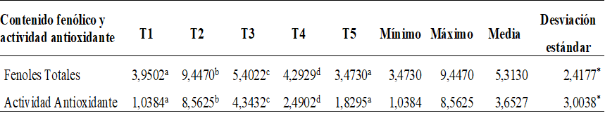 En términos de contenido fenólico y la actividad antioxidante, se observa una variabilidad marcada, donde la muestra T2 (9,447-8,562), exhibe el nivel más alto, seguida por T3, T4, T1 y T5, con una desviación estándar relativamente alta (2,417-3,000), indicando una considerable variabilidad en los contenidos fenólicos entre las muestras, en cuanto a la actividad antioxidante, los tratamientos también muestran variaciones notables, siendo T2 la que presenta el nivel más alto, mientras que las muestras T1 y T5 muestran valores comparativamente más bajos.