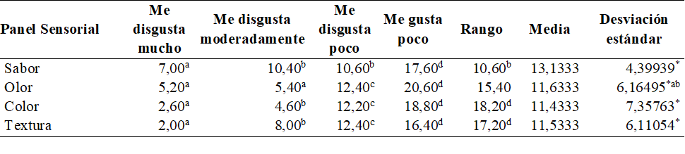 La percepción del sabor varía en un rango de 13.1333, con una media de 10.60 ± 4.39939, la desviación estándar moderadamente alta sugiere cierta variabilidad en las respuestas del panel respecto al sabor, en cuanto a la percepción del olor varía en un rango de 11.6333, con una media de 15.40 ± 6.16495, donde la desviación estándar relativamente alta indica cierta variabilidad en las respuestas del panel respecto al olor, mientras que la percepción del color varía en un rango de 11.4333, con una media de 18.20 ± 7.35763, presentando una desviación estándar alta sugiere variabilidad en las respuestas del panel respecto al color, por último, la percepción de la textura varía en un rango de 11.5333, con una media de 16.40 ± 6.11054. La desviación estándar relativamente alta indica cierta variabilidad en las respuestas del panel respecto a la textura (tabla 4).