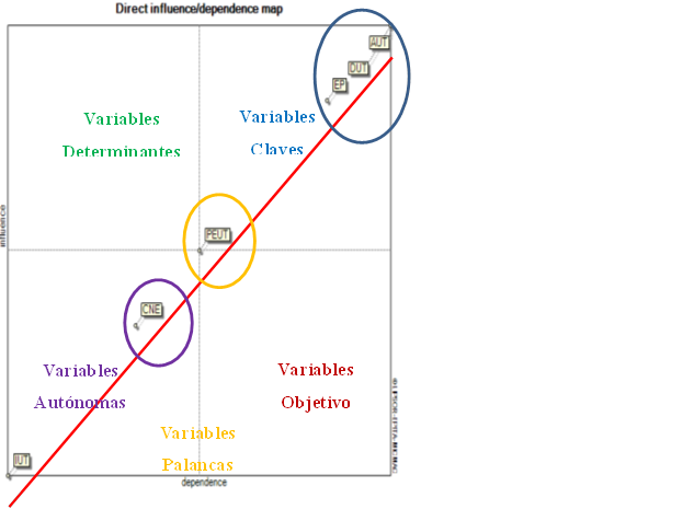 Para dar cierre al análisis del gráfico de influencia directa, se presenta el cuarto y último cuadrante (inferior derecho), se aprecian las variables resultado, que se caracterizan por su baja motricidad y alta dependencia, y suelen ser, junto con las variables objetivo, indicadores descriptivos de la evolución del sistema; allí no se encuentra ubicada ninguna de las variables.