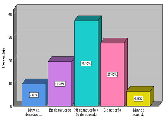 Al explicar el resultado de la variable didáctica en la Tabla 10 de distribución de frecuencia indica que el 6,5% de la muestra en estudio demostraron estar muy de acuerdo en el nivel de enseñanza- aprendizaje, mientras que 27,4% respondieron estar de acuerdo con el nivel de enseñanza-aprendizaje, el 37,1% ni de acuerdo / ni desacuerdo al respecto, el 19,4% se encuentra en desacuerdo y finalmente el 9,7% de los encuestados manifestaron estar muy en desacuerdo con el proceso de enseñanza-aprendizaje de los contenidos.