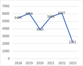 Las bandas o grupos organizados utilizan estratagemas diversas para sorprender y someter a la víctima (Urbano et al., 2017), con fines de explotación sexual preferentemente (Beraún & Cárdenas, 2021). De acuerdo al registro reportado por el Ministerio Público entre el 2018 al 2023; por lo menos 29.400 casos de trata de personas se han reportado. En el año 2020 se ha tenido como reporte 3.915 casos, en el 2022 se presentaron 6.107 casos y en lo que va el 2023 se ha registrado 2.222 casos. (INEI, 2023) (Ver Figura 1).