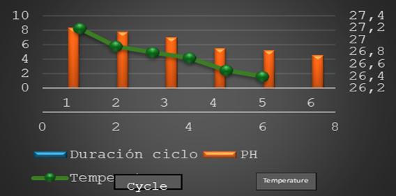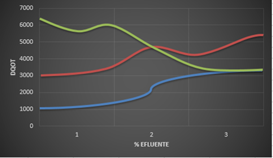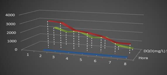 Therefore, the results from Figure 3 confirm that the existing biomass was processing organic matter to grow, reproduce, and carry out metabolic processes. The biomass indicated that it was active at the beginning of the acclimatization process, under optimal conditions, initiating the feeding of the reactor with the synthetic water.