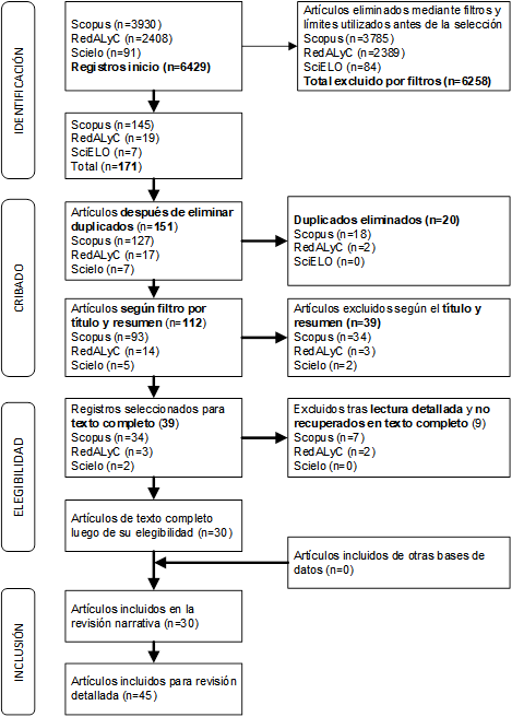 El proceso de selección de estudios se organizó siguiendo el flujograma PRISMA como se observa en la Figura 1 siendo la etapa de identificación el punto inicial donde se recuperaron 6429 registros distribuidos entre Scopus (3930), RedALyC (2408) y SciELO (91) y posteriormente tras aplicar filtros por idioma, año, tipo de publicación y pertinencia temática se redujo el total a 171 artículos potenciales para posteriormente en el cribado se eliminaron duplicados y se revisaron títulos y resúmenes, excluyéndose 112 por no ajustarse a los objetivos del estudio quedando de esta forma 39 para evaluación completa, de los cuales 3 no se pudieron recuperar y 6 fueron descartados tras una lectura detallada dejando un total de 30 que cumplieron con todos los criterios de inclusión.