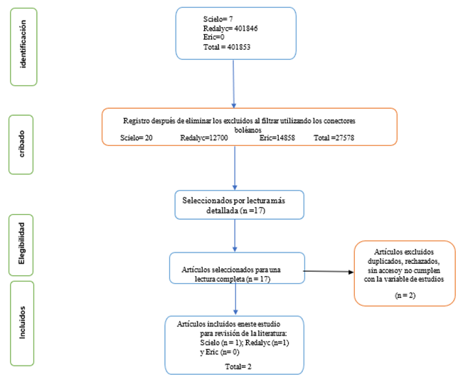 En primer lugar, tras aplicar los protocolos de la declaración PRISMA y los criterios de inclusión y exclusión, se obtuvieron 2 artículos procedentes de las bases de datos SciELO, Eric y Redalyc, los cuales conforman la muestra de este estudio.