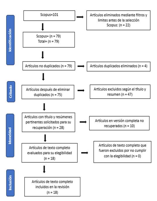 Respecto al procedimiento, inicialmente se buscaron e identificaron los artículos pertinentes, valorando el nivel académico de estos, por lo cual se eligió a los artículos alojados en Scopus. En la etapa de selección se filtraron los artículos incorporando criterios de inclusión y exclusión. En la etapa de elegibilidad se valoró los estudios de selección inicial, considerando el método que usaron. Finalmente, se seleccionaron los estudios relevantes y actuales, los que constituyen el saber sistémico.