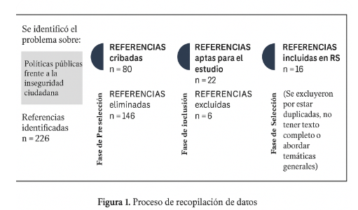 Para la selección de los documentos (artículos científicos) respecto a las Políticas Públicas y la Crisis de inseguridad Ciudadana comunicadas a través de artículos científicos en revistas indexadas en las bases de datos Scopus, WoS y SciELO se realizó en las siguientes fases: identificación de revisión (226), selección (80 documentos); elegibilidad (22 documentos); y, selección (16) artículos de investigación, agrupándolos para el análisis.