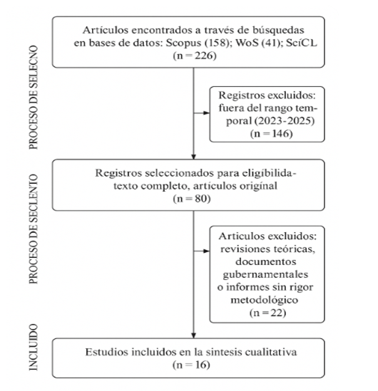 Los criterios de inclusión fueron artículos comprendidos en el periodo 2020-2025, con texto completo, de acceso libre, solo artículos originales e incluidos en las tres bases de datos que guarden relación con las categorías de estudio y que declararon inexistencia de conflictos de interés.