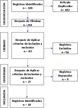 El proceso de análisis siguió las etapas de identificación, selección y síntesis de la información, asegurando la validez y transparencia metodológica. En total, se identificaron 320 estudios, se eliminaron 102 por duplicidad, se revisaron 218 a texto completo y se incluyeron finalmente 27 artículos que aportaron evidencia sustantiva para la discusión sobre la regulación y gestión de la distribución de combustibles líquidos en la región.