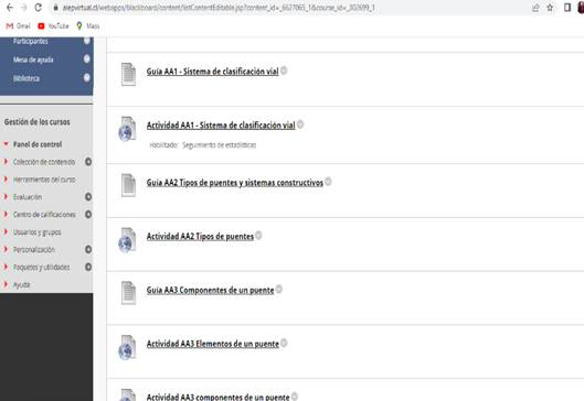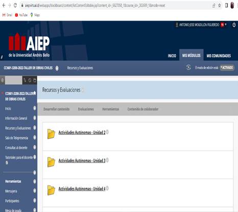 Posteriormente se dio inició la intervención del curso poniendo a disposición de los estudiantes los recursos educativos digitales y las actividades formativas gamificadas, los cuales fueron cargados al ambiente de aprendizaje del AIEP (Blackboard) como se visualiza en la Figura 6.