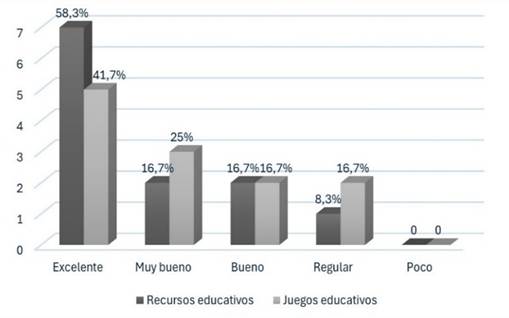 La Figura 11 aunque la mayoría de las actividades gamificadas utilizadas como estrategia de evaluación formativa fueron igualmente valorados de forma positiva, el 33,4% tuvo una valoración más neutra que con respecto a los recursos educativos, esto sugiere que la gamificación es bien recibida, pero su implementación debe ser perfeccionada para aumentar el impacto motivacional intrínseca en ella.