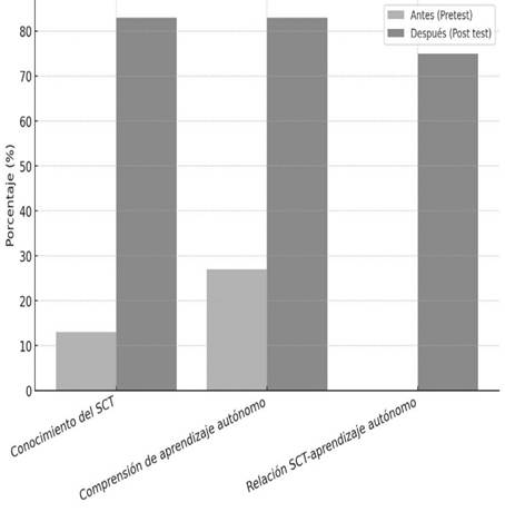La Figura 9, muestra que antes de la intervención realizada, el nivel de conocimiento sobre el Sistema de Créditos Transferibles (SCT) y del aprendizaje autónomo era muy bajo, entre el 10 y el 27%, después del abordaje efectuado los tres ítems superan el 75%, con dos de ellos alcanzando sobre el 80%.
