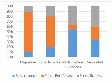 Por otra parte, la revisión bibliográfica permitió distinguir ciertos elementos clave, en la figura 2 muestra los principales factores que inciden en los procesos de gobernanza y sostenibilidad desde una perspectiva territorial, diferenciando su impacto en zonas urbanas, periféricas y rurales. Se observa que la migración afecta predominantemente a las zonas periféricas (más del 80%), lo cual evidencia la presión que estos espacios reciben por la expansión urbana no planificada. En cuanto al uso del suelo, también son las zonas periféricas las más afectadas, representando un alto porcentaje de transformación y ocupación desordenada. La participación ciudadana, en cambio, se concentra en mayor medida en las zonas urbanas, lo que sugiere una mayor articulación institucional y acceso a canales de participación. Por último, el factor seguridad muestra una distribución más equilibrada, aunque con una incidencia destacada en zonas rurales, lo que refleja retos asociados al control territorial y acceso a servicios de protección. Estos datos permiten comprender la necesidad de políticas diferenciadas que reconozcan las particularidades de cada territorio en la formulación de estrategias sostenibles y de gobernabilidad local.