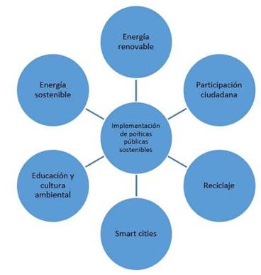 La figura 3 representa una síntesis conceptual derivada de la revisión sistemática realizada, como se aprecia, la implementación de políticas públicas sostenibles se articula con seis componentes clave que emergen con mayor recurrencia y relevancia en la literatura especializada: energía renovable, energía sostenible, educación y cultura ambiental, smart cities, reciclaje y participación ciudadana. Estos elementos reflejan enfoques integrales orientados a promover territorios resilientes, con una visión estratégica de largo plazo. La revisión permitió identificar que estos componentes no solo actúan como ejes de acción individual, sino que están interrelacionados dentro de una lógica sistémica que fortalece la capacidad de los gobiernos locales para generar valor público, mejorar la calidad de vida urbana y responder a los desafíos ambientales, económicos y sociales del siglo XXI.