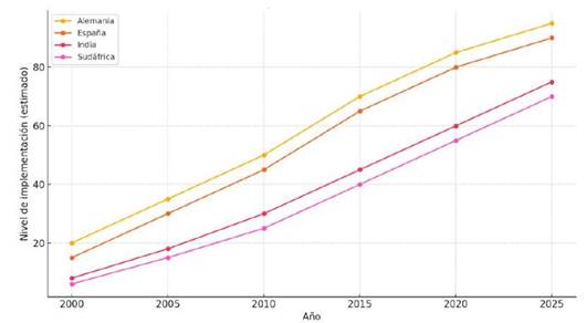 La figura 4 presenta una estimación comparativa de la evolución en la implementación de políticas de sostenibilidad urbana y gobernanza local entre los años 2000 y 2025 en seis países que destacan por sus avances: Alemania, España, Brasil, India y Sudáfrica. Estos países han demostrado un crecimiento sostenido en el diseño e implementación de estrategias orientadas a la sostenibilidad, integrando aspectos sociales, económicos y ambientales. Alemania ha liderado con iniciativas como las zonas verdes urbanas y eficiencia energética; España ha promovido la Agenda Urbana Española con impacto en ciudades como Barcelona; Brasil ha desarrollado modelos sostenibles desde Curitiba; India ha desplegado la iniciativa 'Smart Cities Mission'; y Sudáfrica ha enfocado sus políticas en la inclusión y resiliencia urbana. Esta evolución refleja un compromiso creciente con el desarrollo sostenible, apoyado por la colaboración internacional y la consolidación de marcos normativos y estratégicos de largo plazo.