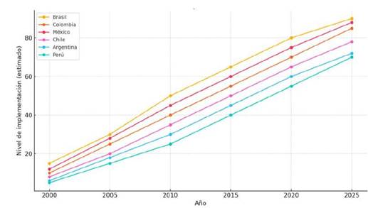 En el caso específico de Latinoamérica se presenta la figura 5, que muestra una estimación de la evolución de políticas de sostenibilidad urbana y gobernanza local en seis países de América Latina entre los años 2000 y 2025. Los países seleccionados -Brasil, Colombia, México, Chile, Argentina y Perú- han demostrado avances importantes en la incorporación de criterios sostenibles en sus políticas públicas, impulsados por el crecimiento urbano, los compromisos internacionales y la necesidad de fortalecer la gobernabilidad en contextos descentralizados. Brasil y Colombia lideran este proceso gracias a sus marcos normativos y la participación en redes internacionales como ICLEI y C40. México y Chile destacan por sus programas de ciudades inteligentes y políticas climáticas. Argentina y Perú, aunque con ritmos más moderados, han incrementado sus esfuerzos en la planificación urbana sostenible. Esta evolución regional refleja un compromiso progresivo con la mejora de la calidad de vida urbana mediante enfoques inclusivos, ambientalmente responsables y estratégicamente diseñados para garantizar una gobernanza local más sólida.