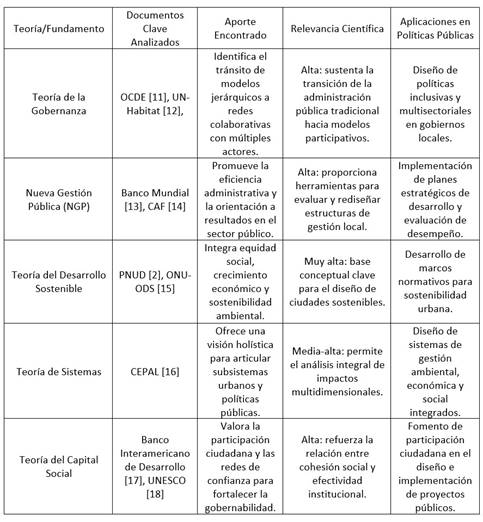 La tabla 1 resume los principales hallazgos teóricos obtenidos a partir de la revisión sistemática realizada en el marco del estudio sobre gobernanza, sostenibilidad y gestión local. Se destacan las teorías fundamentales que sustentan el análisis, los documentos científicos revisados, los aportes teóricos encontrados, la relevancia científica de cada enfoque, y sus aplicaciones prácticas en el diseño e implementación de políticas públicas. Esta sistematización permite establecer una base conceptual sólida para la construcción de marcos de referencia orientados a la gestión sostenible en los gobiernos descentralizados.