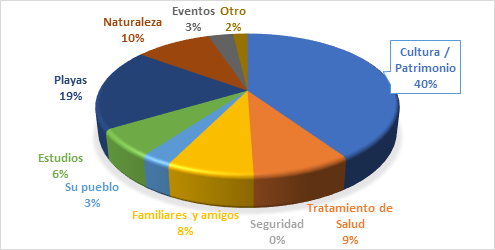 Con relación a los motivos de viajes el primer lugar lo ocupa la cultura y patrimonio con el 40%, seguido de playas con el 19% y la naturaleza con el 10% tal como se muestra en la figura 1. Solo el 9% refiere motivaciones asociadas a la salud.