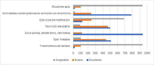 Las variables tratamientos de belleza, ejercicios de meditación y musicoterapia son las que poseen mayor porcentaje de aceptables con un 88%, 64% y 88,2% respectivamente.