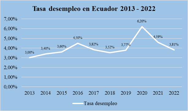 Durante el periodo comprendido entre 2013 y 2022, la tasa de desempleo en Ecuador mostró una evolución notable, marcada por diversas fluctuaciones que reflejan los cambios económicos y sociales en el país. En 2013, la tasa de desempleo estaba en un nivel del 3,00%, una cifra relativamente baja que indicaba una situación laboral estable. Sin embargo, en 2014, se observó un incremento al 3,40%, y en 2015, la tasa subió nuevamente a 3,60%. Este incremento gradual puede atribuirse a factores económicos globales, como el declive de los precios del petróleo, que afectaron la economía ecuatoriana. Según el Banco Central del Ecuador (2016), la disminución de los precios del petróleo en 2014 y 2015 generó un efecto adverso considerable en la economía de Ecuador, disminuyendo los ingresos fiscales y restringiendo la capacidad del gobierno para sostener el gasto público y los programas de empleo.