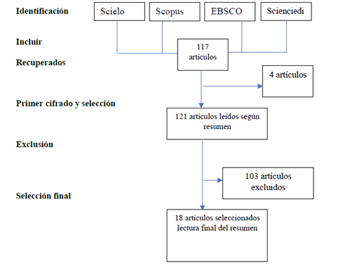 Se identificaron un total de 117 artículos a partir de la estrategia de búsqueda. Después de eliminar duplicados y discrepancias en la información presentada y agregar los artículos a la lista de referencias, se realizó un análisis de relevancia, se aplicaron criterios de inclusión y exclusión, y también se realizó una selección de publicaciones indexadas: Scielo, Scopus, EBSCO, y Scienciedirect, con el objetivo de optimizar la información y asegurar la veracidad de las mismas. Además, para seleccionar los estudios e información se consideró los lineamientos PRISMA, con la obtención final de 18 artículos que conformaron la base del estudio.
