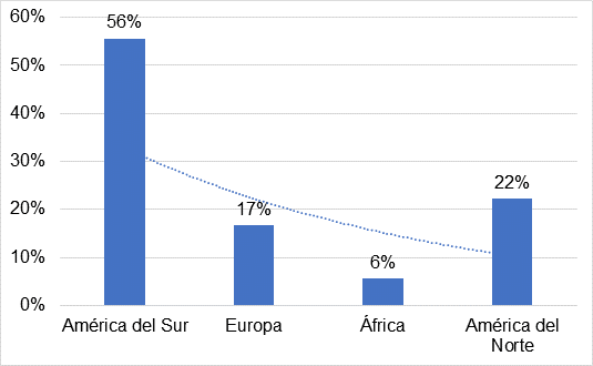 Según el lugar en donde se realizaron las publicaciones, en América del Sur fueron en mayor medida con 56% que representa a los países de Perú, Chile, Paraguay y Ecuador, demostrando que existen similares características en el tratamiento del presupuesto público. También, América del Norte a través de Estados Unidos, México y Cuba tuvieron una representación del 22%, seguido de Europa con Portugal, Alemania y Azerbaijan con 17% y finalmente, África a través de Egypto con 6%.