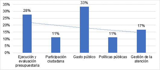 Según las dimensiones principales de evaluación en los artículos científicos seleccionados tenemos al gasto público con 33% que cuenta con algunas limitantes como sostiene, la gestión del presupuesto no es lineal y está condicionada a los tipos de descentralización, por tanto, el gasto cambia de positiva a negativa dependiendo del grado de descentralización del gasto fiscal. Así mismo, en relación al gasto público, indica que con un buen gasto per cápita, se puede reducir los niveles de pobreza y con ello mejorar la educación, pero el sector de salud no cuenta con indicadores suficientes para demostrar su efectividad. También otra dimensión que se evalúo fue la ejecución y evaluación presupuestaria con 28% que se basa en el seguimiento de los compromisos y la revisión de las solicitudes de presupuesto, y es un mecanismo que permite utilizar los resultados de la evaluación, generando información útil que permite mejorar la evaluación de los servicios sociales. Así mismo, Para lograr evaluaciones de calidad, generar información útil para la toma de decisiones y diseñar adecuadamente programas e intervenciones, es necesario el uso de indicadores de desempeño, transparencia y confianza pública. El gestionar la atención estuvo centrada en la prestación de servicios públicos para mejorar el valor de la población también se evaluó, pero no se gestionó de manera eficiente, como discute CEPAL (2019), quien sostiene que existe la necesidad común del estado por hacer partícipes a los pobladores para la planificación de recursos presupuestarios, en donde se proyecte la participación social, estimulando los gastos públicos basados en las necesidades identificadas. Y finalmente con 11% se estudió la participación ciudadana y las políticas públicas, sustentadas en la asignación de fondos públicos para mejorar la efectividad de las inversiones, para lo cual es necesario que el diseño del presupuesto esté enfocado a programas presupuestarios con cierre de brecha