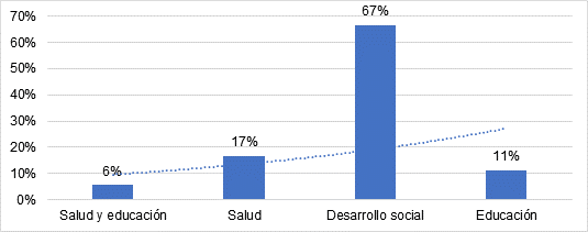 Según el sector de intervención con las investigaciones se lograron evidenciar que en su mayoría fueron en el enfoque de desarrollo social con 67%, demostrando el gran compromiso que ponen los estados en la atención a la colectividad para minimizar el cierre de brechas económicas y sociales que son altamente necesarias para aumentar el bienestar, Además, los artículos se centran en la evaluación de la salud con 17%, educación 11% y salud y educación a la vez con 6%.