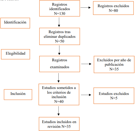 De la búsqueda tenemos: 130 artículos: 20 de Scopus, 30 de Scielo, 50 ProQuest y 30 en scholar Google, los cuales se descargó en archivos de texto, se analizaron en una data de Excel, se establecieron criterios de inclusión donde se consideró el periodo del 2018 al 2024 de las palabras clave objeto de estudio, en la exclusión, estudios de tipología documental, informes, actas no relacionadas al estudio.