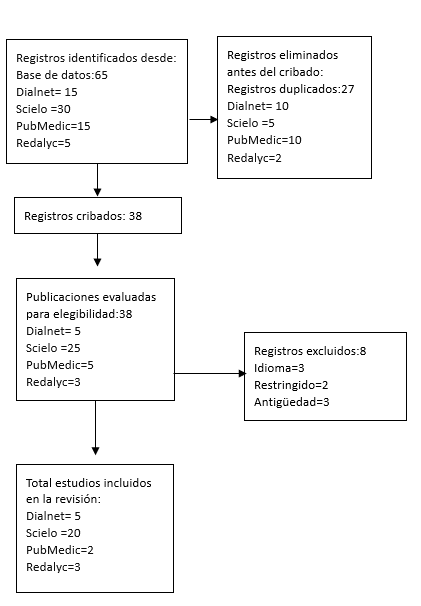 Para llevar a cabo este artículo titulado "Infecciones post quirúrgicas en prótesis de cadera: Una revisión bibliográfica", se empleó una metodología de revisión bibliográfica. Este enfoque metodológico se fundamenta en el protocolo PRISMA (Preferred Reporting Items for Systematic Reviews and Meta-Analyses), reconocido por su claridad y rigurosidad en la síntesis de estudios (Gómez et al., 2014). Ver Figura 1.