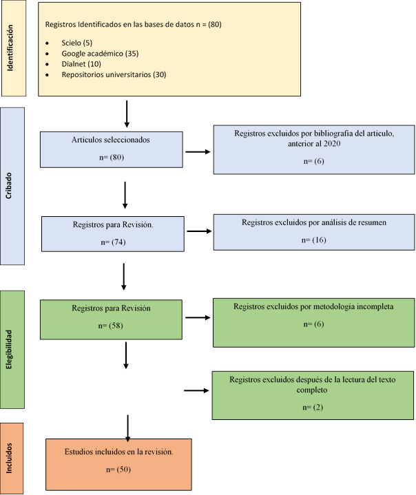 La metodología PRISMA se enfoca en varios aspectos específicos de la revisión sistemática, incluyendo la estrategia de búsqueda utilizada para identificar estudios relevantes, los criterios empleados para seleccionar artículos, la evaluación de la calidad metodológica de los estudios incluidos, y la síntesis clara y concisa de los hallazgos. Inicialmente, se localizaron 80 registros en diversas bases de datos como Scielo (5), Google Académico (35), Dialnet (10) y repositorios universitarios (30). Estos registros pasaron por un proceso de filtrado en el que se excluyeron 6 referencias bibliográficas anteriores a 2020. A continuación, se analizaron los resúmenes de los artículos restantes, lo que resultó en la exclusión de 16 registros que no eran relevantes para el estudio. Posteriormente, se revisaron los detalles metodológicos de los estudios restantes, lo que llevó a la exclusión de 6 registros debido a metodologías incompletas. Finalmente, se realizó una lectura completa de los artículos restantes, lo que resultó en la exclusión de 2 registros adicionales. Este proceso garantizó la selección cuidadosa de los artículos más pertinentes y adecuados para la revisión bibliográfica.