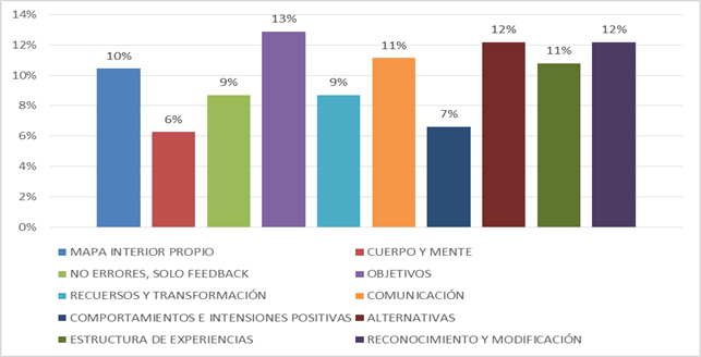 En los 50 artículos analizados los principios básicos identificados fueron: los objetivos en 13%, reconocimiento y modificación en 12%, alternativas en 12%, comunicación y estructura de experiencias en 12% cada una. Estos representan los principios que se les enseñó a los participantes de los estudios. Se toma en cuenta que estos son esenciales y sientan las bases para los resultados consultados en las investigaciones. Que los objetivos sean centrales demuestra que la intersección entre lo intrapersonal con lo interpersonal.