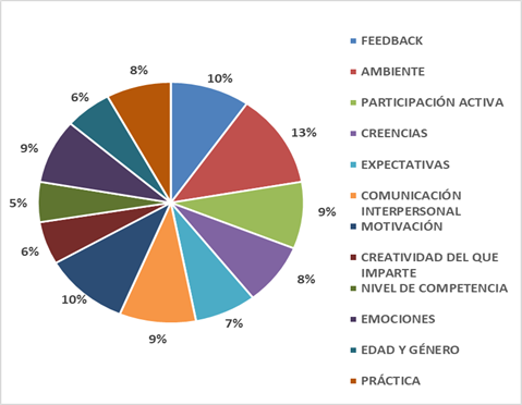 El ambiente es la característica número uno con el 13%, seguida por el feedback y la motivación con 10%, el 18% se lo lleva la comunicación interpersonal y las emociones. Esto significa que los factores imperantes en los 50 estudios analizados son los más populares entre la comunidad que busca sacarles provecho a nuevas formas de aprendizaje. Poco se toma en cuenta asuntos como la creatividad de los docentes o personas que imparten coaching sobre la Programación Neurolingüística. La edad y género tiene poca presencia puesto que la PNL se ha tomado como una forma de aprendizaje que garantiza no tiene restricciones en estas características