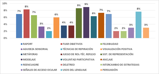 Estas fueron las principales técnicas de programación Neurolingüística que utilizaron en los 50 artículos analizados: El sistema de representación en 9%, al igual que el modelaje; el uso del lenguaje en 8% que se define como aquellas reglas y técnicas lingüísticas, que se usan para identificar y corregir las distorsiones, omisiones y generaciones del lenguaje, que llevan a una comunicación eficaz; con el 8% está la técnica de fijar objetivos que tanto en la vida personal como profesional impulsa a la confianza y la motivación de los individuos (Keezhatta, 2019); y el rapport con el 7% que representa una conexión profunda y un entendimiento entre las personas con el uso del lenguaje corporal, el tono, la postura, etc. (Popescu, 2023); estas tres técnicas se relacionan y convergen. El planteamiento de objetivos ayuda al individuo a establecer su enfoque, que en la Programación Neurolingüística primero se dirige a la comunicación; es congruente entonces que la primera técnica reflejada en el análisis sea la del uso del lenguaje. Por consiguiente, al tener las bases (objetivos y lenguaje) se escala a la técnica de rapport para establecer relaciones interpersonales efectivas.