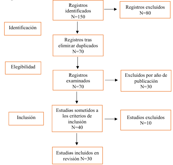 Tras la búsqueda, se obtuvieron 150 artículos, de los cuales se descargaron y almacenaron 10 de Scopus, 25 de Dialnet, 20 de Google Book, 20 de Latindex, 10 de Researchgate, 20 de Redalyc y 45 de Google Scholar en archivos de texto. Estos fueron organizados en una matriz en Excel, estableciendo criterios de inclusión basados en el periodo de estudio y las palabras clave, así como criterios de exclusión para eliminar estudios no pertinentes al tema en cuestión. Se seleccionaron específicamente 12 artículos de años anteriores debido a su relevancia y contribuciones significativas al estudio, considerando que es un tema poco explorado en la literatura existente, seleccionando 30 artículos.