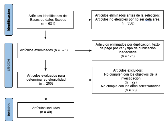 Tras una exhaustiva búsqueda en la base de datos Scopus, se identificaron un total de 278 artículos en español, 322 en inglés y 121 en portugués, con algunos artículos disponibles en más de un idioma. En conjunto, se contabilizaron 681 artículos. No obstante, al aplicar los criterios de selección predefinidos, se excluyeron 356 artículos, lo que resultó en un total de 325 manuscritos que cumplían con los requisitos establecidos. Posteriormente, se llevó a cabo una verificación de la accesibilidad de estos documentos, lo que arrojó un número final de 200 artículos, con la exclusión de 125 documentos para un resultado de 40 artículos.