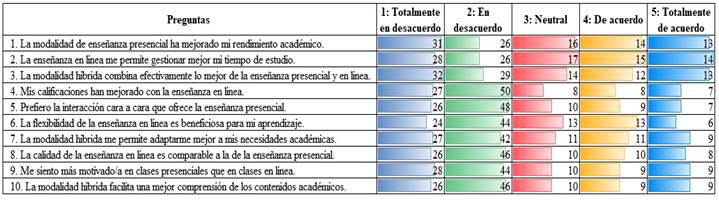 Respecto a la modalidad híbrida, la mayoría de los estudiantes no creen que combine efectivamente lo mejor de la enseñanza presencial y en línea; además; la percepción general es que la modalidad híbrida no se adapta bien a sus necesidades académicas. Sin embargo, la prueba de chi-cuadrado reveló una asociación estadísticamente significativa.