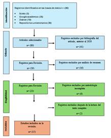 La metodología PRISMA se enfoca en garantizar un enfoque estructurado y transparente en la realización de revisiones sistemáticas. Para este estudio, se utilizó una estrategia de búsqueda en diversas bases de datos como Scielo (5), Google Académico (35), Dialnet (10) y repositorios universitarios (30), lo que inicialmente arrojó 80 registros. Estos registros fueron sometidos a un proceso de filtrado riguroso.