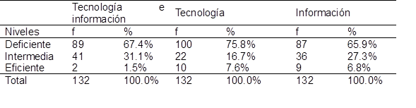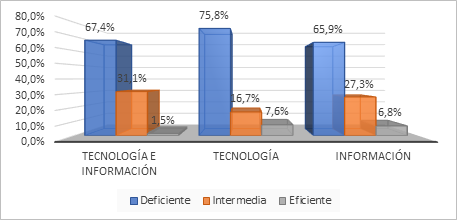 La Tabla 3 y la Figura 2 destacan que solo el 1.5% de los encuestados emplea la tecnología e información de manera eficiente, mientras que el 31.1% tiene un uso intermedio y el 67.3% presenta un uso inadecuado. En la dimensión de tecnología, el 7.6% califica su uso como eficiente, el 16.7% como intermedio y el 75.8% como deficiente. Por otro lado, en la dimensión de información, el 6.8% considera su uso eficiente, el 27.3% intermedio y el 65.9% deficiente. Estos hallazgos subrayan la necesidad de incorporar equipos técnicos más eficaces y adecuados al servicio ofrecido al público.