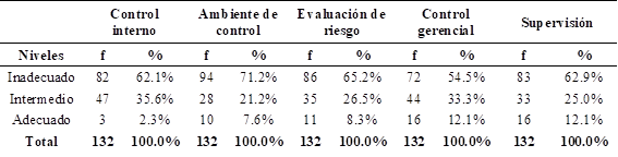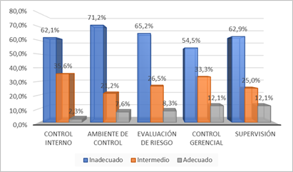 La Figura 3 y la Tabla 4 revelan los niveles y frecuencias relacionadas con la percepción del control interno entre los funcionarios de los centros de salud de Arequipa. Solo el 2.3% considera que el control interno es adecuado, el 35.6% lo califica como intermedio, y el 62.1% lo percibe como inadecuado. En la dimensión de ambiente de control, el 7.6% lo valora como adecuado, el 21.2% como intermedio y el 71.2% como inadecuado. Respecto a la evaluación del riesgo, el 8.3% la considera adecuada, el 26.5% intermedia y el 65.2% inadecuada. En la dimensión de control gerencial, el 12.1% la califica como adecuada, el 33.3% intermedia y el 54.5% inadecuada. Finalmente, en la supervisión, el 12.1% la percibe como adecuada, el 25% intermedia y el 62.9% inadecuada. Estos resultados reflejan deficiencias significativas en la protección de activos económicos, intangibles y materiales, atribuibles a la falta de cumplimiento de los procedimientos y a la vulnerabilidad de los equipos y datos.
