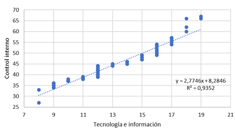 La ilustración gráfica de la correlación entre la tecnología e información y el control interno puede verse en la Figura 5. Dado que los puntos siguen una línea recta desde abajo a la izquierda hasta arriba a la derecha, se puede decir que la correlación es significativa y directa. El valor de R cuadrado es 0.935 (0.935 x 100% = 93.5%). Esto significa que la tecnología e información tiene una influencia de 93.4% en el control interno.