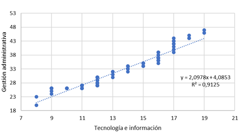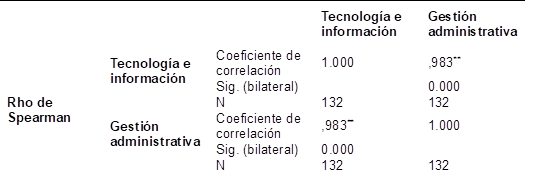 Los resultados del análisis Rho de Spearman muestran una relación positiva entre las variables tecnología e información y la gestión administrativa (r = 0.983), con una significancia estadística de 0.000, inferior al p valor. Razón por la cual, se admite la hipótesis alterna y se niega la hipótesis nula.