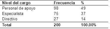 Por otra parte, la población en un estudio incluye a todos los individuos dentro del ámbito de la investigación. Este grupo abarca las ocurrencias de un fenómeno que comparten características específicas, siendo la base para recolectar los datos pertinentes (Hernández-Sampieri & Mendoza, 2018). En este caso, la investigación consideró a 200 funcionarios de centros de salud de Arequipa, clasificados en tres categorías: trabajadores de apoyo, directivos y especialistas (véase la Tabla 1).