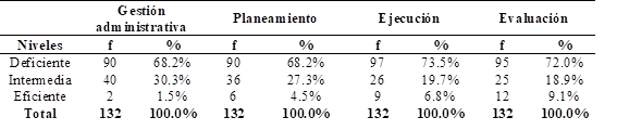 La Tabla 5 y la Figura 4 presentan las percepciones de los encuestados sobre la gestión administrativa en los centros de salud de Arequipa. Solo el 1.5% califica la gestión administrativa como eficiente, el 30.3% como intermedia y el 68.2% como deficiente. En la dimensión de planeamiento, el 4.5% la considera eficiente, el 27.3% intermedia y el 68.2% deficiente. Para la dimensión de ejecución, el 6.8% la califica como eficiente, el 19.7% intermedia y el 73.5% deficiente. Estos resultados reflejan una gestión administrativa que no promueve liderazgo ni compromiso institucional, presenta deficiencias en la asignación presupuestaria, carece de evaluaciones regulares y no establece objetivos claros, lo que afecta el desempeño global de las instituciones.