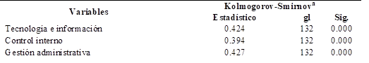 Para determinar si los datos están distribuidos adecuadamente, se empleó la prueba de normalidad de Kolmogorov-Smirnov. Esta determina si en la investigación se emplea estadística inferencial paramétrica o no. Según la Tabla 6, la variable tecnología e información tuvo un valor de 0.424, control interno de 0.394 y gestión administrativa de 0.427, todos estos valores tuvieron un nivel de significancia de 0.000. En consecuencia, los datos del estudio no siguen una distribución normal porque el valor p es inferior a 0.05. Por este motivo, en el análisis de correlación de hipótesis se utilizó el estadístico no paramétrico Rho de Spearman.