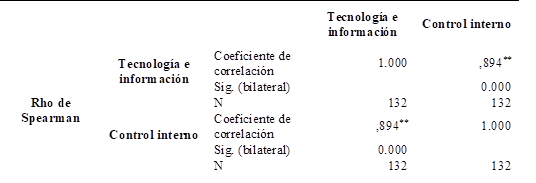 Con una correlación positiva de r = 0.894 y una significancia estadística de 0.000, que es inferior a 0.05, se establece que la variable tecnología e información está directamente relacionada con el control interno. En consecuencia, se acepta la hipótesis alterna y se rechaza la hipótesis nula.